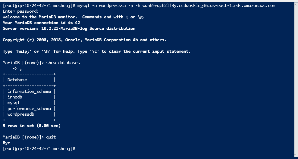 The user name and password are whatever you entered into the parameters when you deployed the stack. The host name is the CNAME for your RDS instance, which you can get from RDS in the console, or the Outputs tab of your stack in the CloudFormation console. If you are able to connect, and you can run show databases, and your database is listed (mine is wordpressdb), then you’re in business.